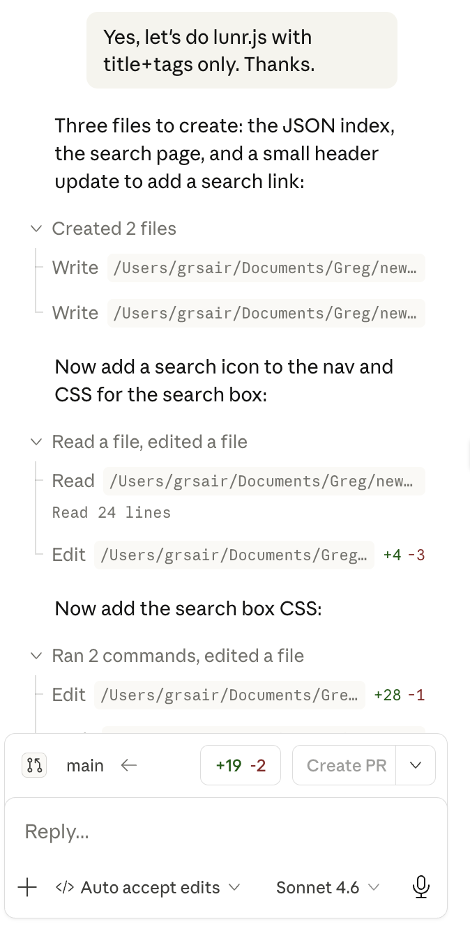 Code reuse in this space is amazing. A few of the features I’ve added include small indicators of how long it takes to read an individual blog post. This was a one-liner add. It is a built-in feature of Jekyll, the site generator tool Claude uses to create my site. I’ve also added the ability to search all of the blogs using Lunr.js. It’s a small javascript search utility. I’d never heard of Lunr.js, but Claude did. I asked for the ability to search the blog, and it laid out three different approaches. I just chose one.